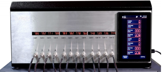 • 12 onafhankelijke, galvanisch gescheiden testkanalen (balancering) voor de batterijmodule (Ni-Mh of Li-Ion).